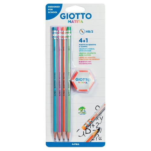 Set matite grafite gradazione HB/2 sezione esagonale 4 pz con gomma cancellare GIOTTO 233500