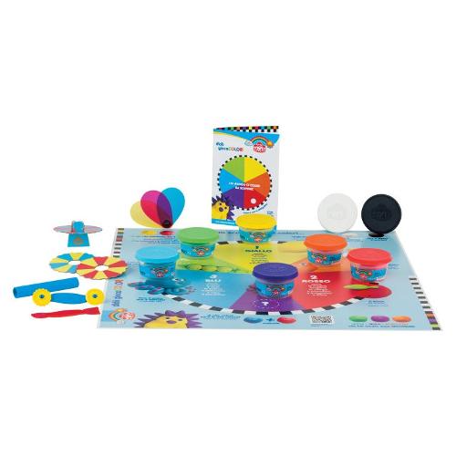 Il gioco ha inizio sul fronte della confezione con la ruota che gira e invita a scoprire tutte le attività proposte all’interno. Il divertimento continua con il ricchissimo contenuto di giochi, spunti e suggerimenti per andare alla scoperta dei colori e delle sue alchimie. La confezione include: 8 barattoli da 100g, 1 maxi tovaglietta gioco 60x60cm, 1 libricino con la teoria del colore, accessori