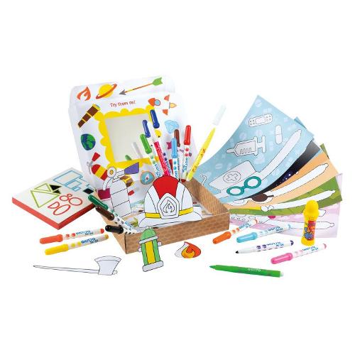 Confezione 14 pennarelli superlavabili, 3 pennarelli giotto turbo maxi fluo, 6 maschere da colorare e personalizzare in 6 soggetti: pirata, principessa,astronauta, pompiere, indiano e dottore, 1 colla stick 20g