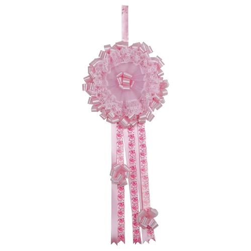 Coccarda fiocco rosa in tulle, nastro tht idrorepellente, nastro in poliestere, cartoncino colorato. Altezza 90 cm larghezza 40 cm nastri compresi. Non esporre alle intemperie. Prodotto artigianale che potrebbe presentare differenze dalla foto perchè fatto manualmente