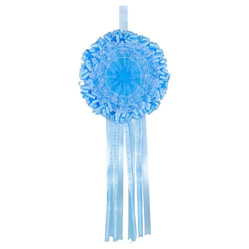 Coccarda fiocco azzurro in tulle, nastro tht idrorepellente, nastro in poliestere, cartoncino colorato. Altezza 140 cm larghezza 58 cm nastri compresi. Non esporre alle intemperie. Prodotto artigianale che potrebbe presentare differenze dalla foto perchè fatto manualmente