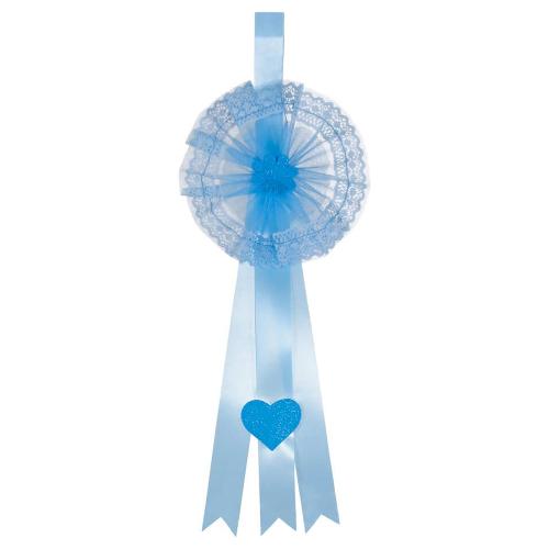 Coccarda fiocco azzurro in tulle, nastro tht idrorepellente, nastro in poliestere, cartoncino colorato. Altezza 37 cm larghezza 16 cm nastri compresi. Non esporre alle intemperie. Prodotto artigianale che potrebbe presentare differenze dalla foto perchè fatto manualmente