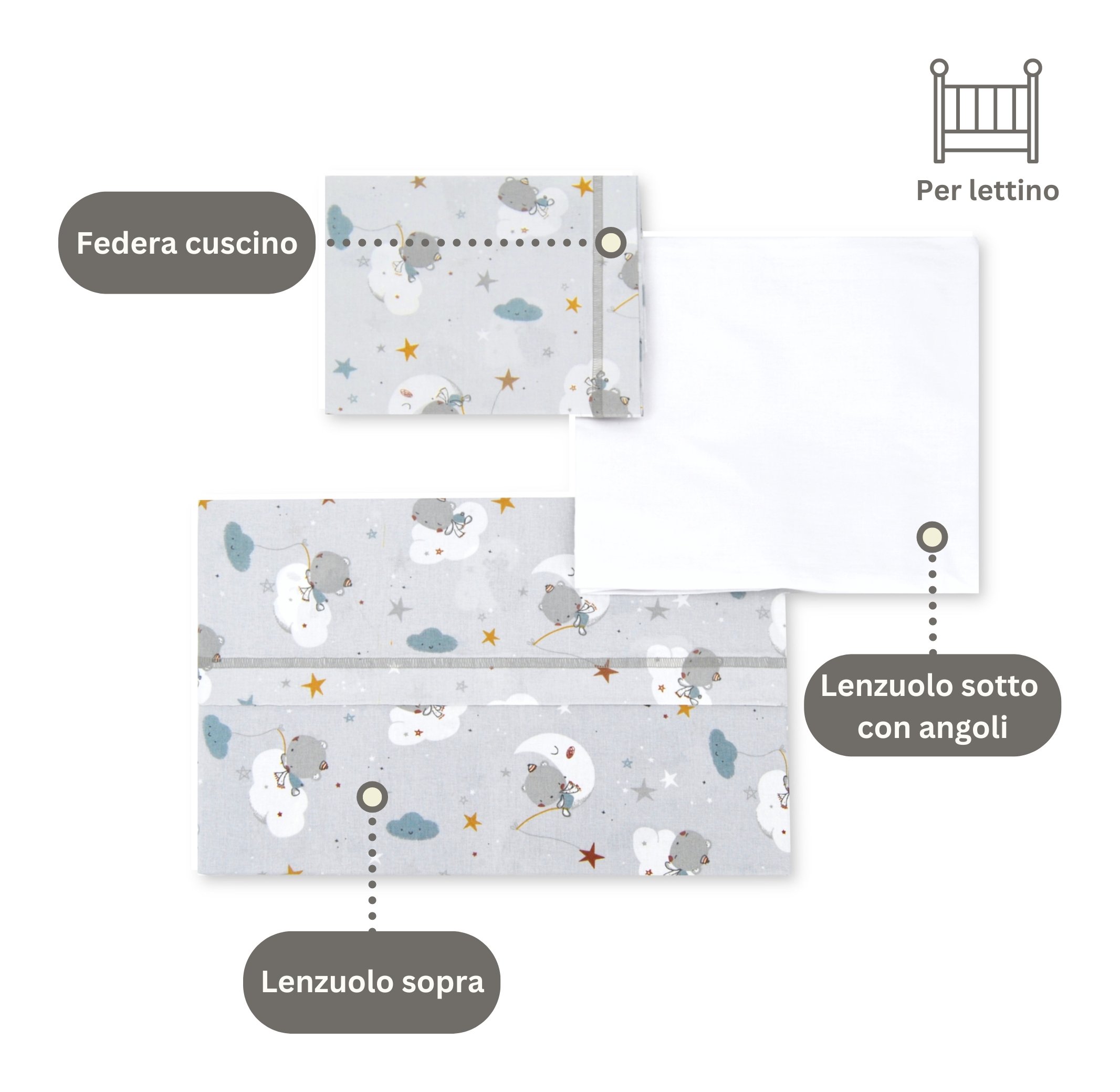 Set lenzuola lettino completo 3 pz Fantasia grigio LLKG
