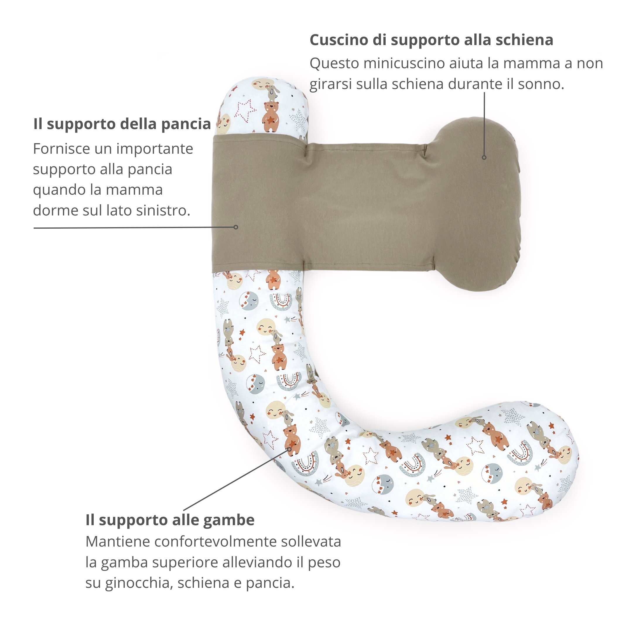 Polly è un cuscino per la gravidanza studiato per migliorare la salute e il comfort della mamma e del bambino. Ha un supporto regolabile per sostenere la schiena, la sua forma è indicata per sostenere pancia e ginocchia e favorisce il riposo e un corretto posizionamento