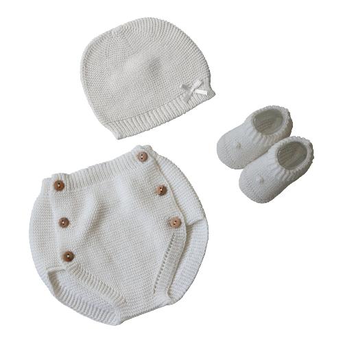 Caldissime scarpine, cappellino e mutandina intessute in morbida maglia di puro cotone: tutto il calore di cui ha bisogno un bebè, oltre alle braccia di chi lo ama.