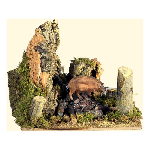 Ambientazione con pareti in sughero, maiale girarrosto con movimento e lampadina effetto fiamma.