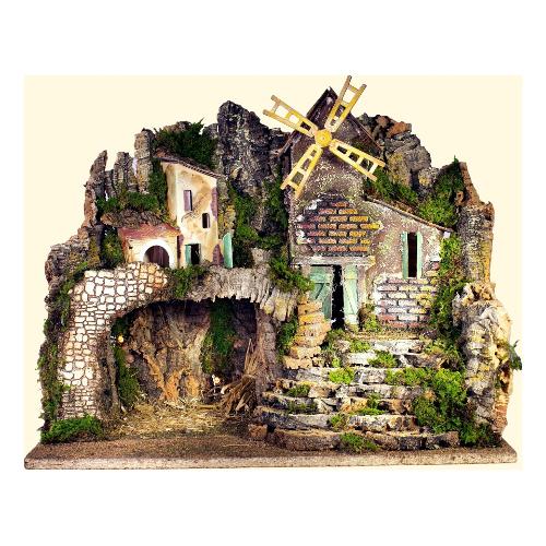Il borgo per presepe è realizzato a mano da artigiani italiani, sono presenti un mulino a vento con motorino 220v e 3 statuine da 10 cm.