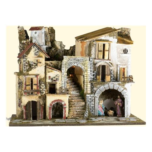 Borgo illuminato con casette tra le rocce in sughero, con scalinata e grotta con natività di 10 cm. 44x60x34 cm