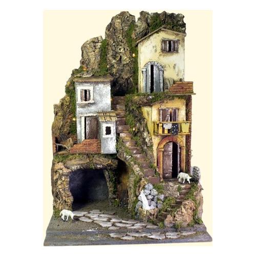 Ambientazione con grotta per la natività, casette con balconi e abiti stesi, pecorelle e una fontana.