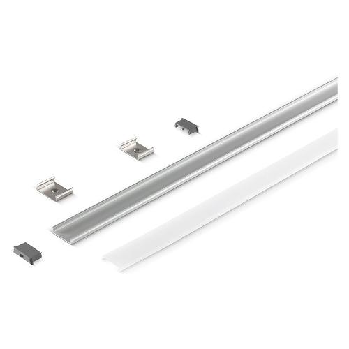 Profilo in alluminio da superficie per strisce LED lungo 2 m con diffusore opale ad incastro. Finitura grigio alluminio. Accessori inclusi