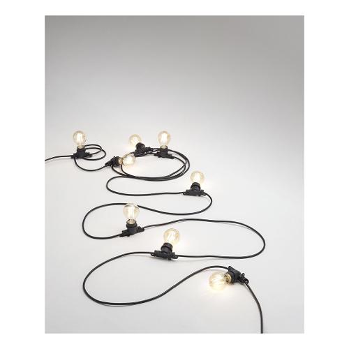 Catena luminosa dotata di 10 portalampade. Cavo elettrico resistente in gomma di colore bianco o nero con sezione 2x1 mm, totalmente impermeabile con un grado di protezione IP44, prolungabile da entrambi i lati con altre catene fino al raggiungimento della lunghezza desiderata. Connettori da entrambi i lati impermeabili e dotati di chiusura con scatto di sicurezza Accessori per il fissaggio non forniti e non disponibili
