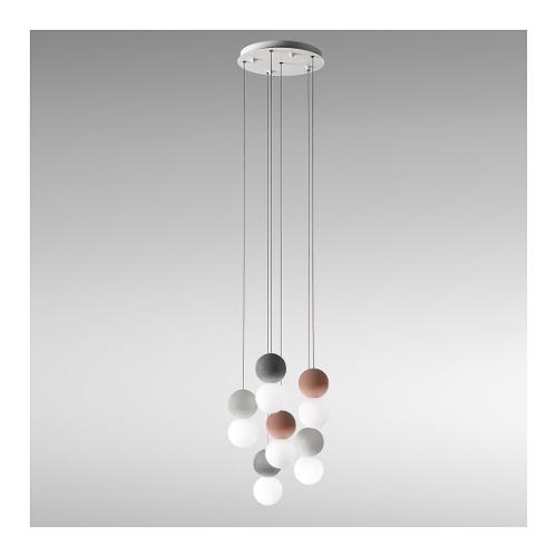 Forme geometriche perfette danzano in un gioco di altezze e materia generando un design unico e personalizzabile. Una collezione definita da più elementi che compongono delle sospensioni ben strutturate, da collocare a diverse sommità, in cui ogni punto luce si caratterizza per un elemento in materiale cementizio e un diffusore sottostante in vetro borosilicato, soffiato, bianco opaco. Evoluzione continua