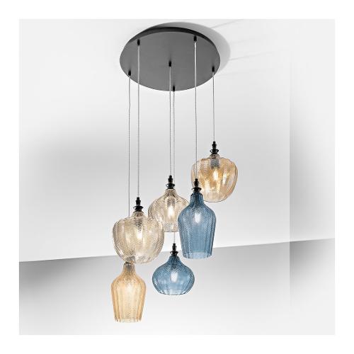 Eclettica nello stile, certamente raffinata nei toni e nella scelta dei colori. Una vera cascata di luci e forme differenti accomunate da una particolare lavorazione artistica del vetro con la decorazione in rilievo sviluppata a spina di pesce