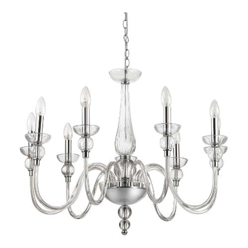 Lampadario in vetro trasparente soffiato e lavorato a mano. Montatura e dettagli in metallo rifinito in cromo