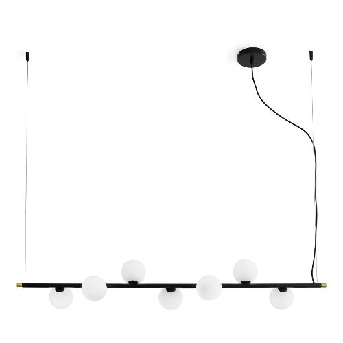 Lampada a 7 luci in vetro soffiato bianco latte diametro cm 10. Montatura verniciata nero con particolari in oro spazzolato. Lunghezza tubo 124 cm, altezza cavi max 120 cm