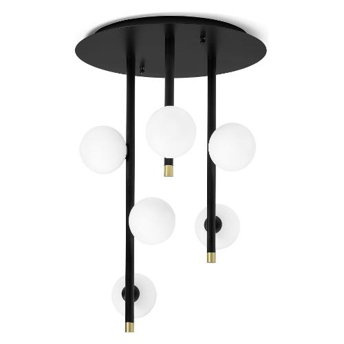 Lampada a 6 luci in vetro soffiato bianco latte diametro cm 10, base diametro cm 40. Montatura verniciata nero con particolari in oro spazzolato. Altezza lampada cm 62,5