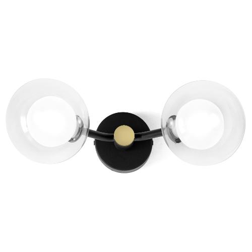 Lampada a 2 luci in vetro borosilicato trasparente esterno e satinato interno, diametro 12 cm. Montatura in metallo verniciato nero con particolare in oro spazzolato