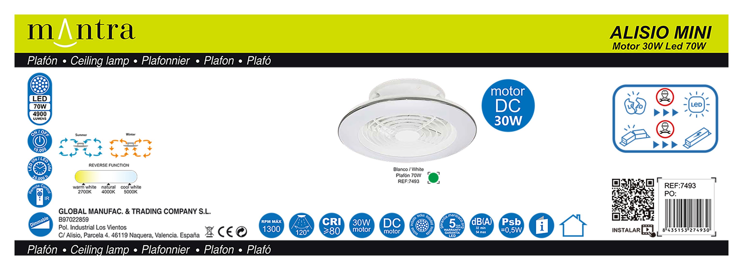 Grazie alla configurazione e al design compatti, offre una sicurezza rassicurante nascondendo le sue pale trasparenti, in modo esteticamente discreto, evitando pericoli e incidenti involontari. Il telecomando incluso rende l'utilizzo della luce del ventilatore semplice e intuitivo.