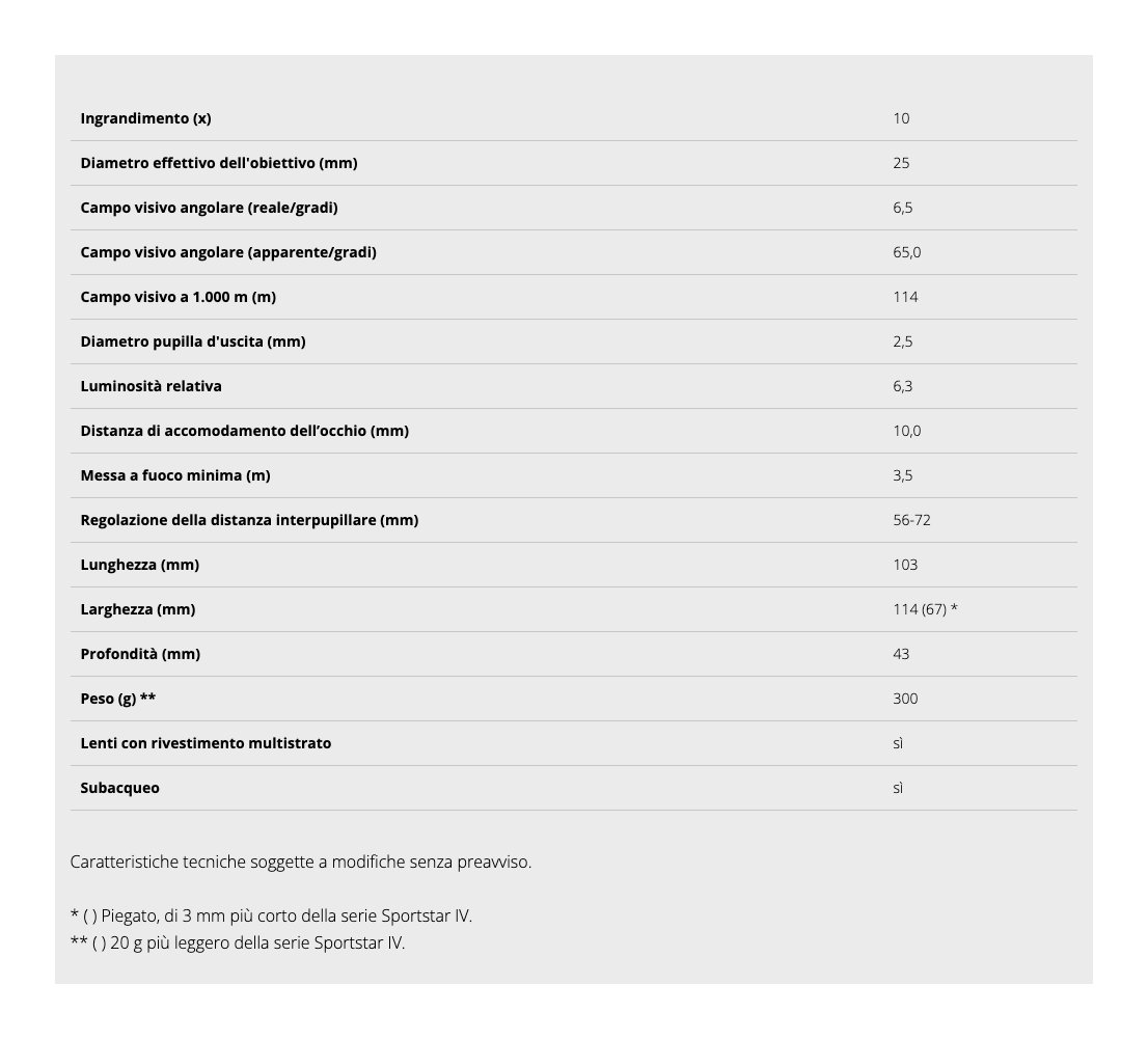 Binocolo leggero con corpo sottile ed elegante, ingrandimento 10x, obiettivo da 25 mm e ampio campo visivo. Le lenti con rivestimento multistrato assicurano immagini luminose e chiare anche in condizioni di scarsa illuminazione. Il corpo è dotato di un rivestimento in gomma per una presa sicura. La compattezza permette inoltre di trovargli sempre un posto in tasca o in borsetta. Il perfetto compagno di viaggio, questo modello è l’ideale per una vasta gamma di attività, tra cui il trekking, l’osservazione della natura e gli eventi sportivi.
