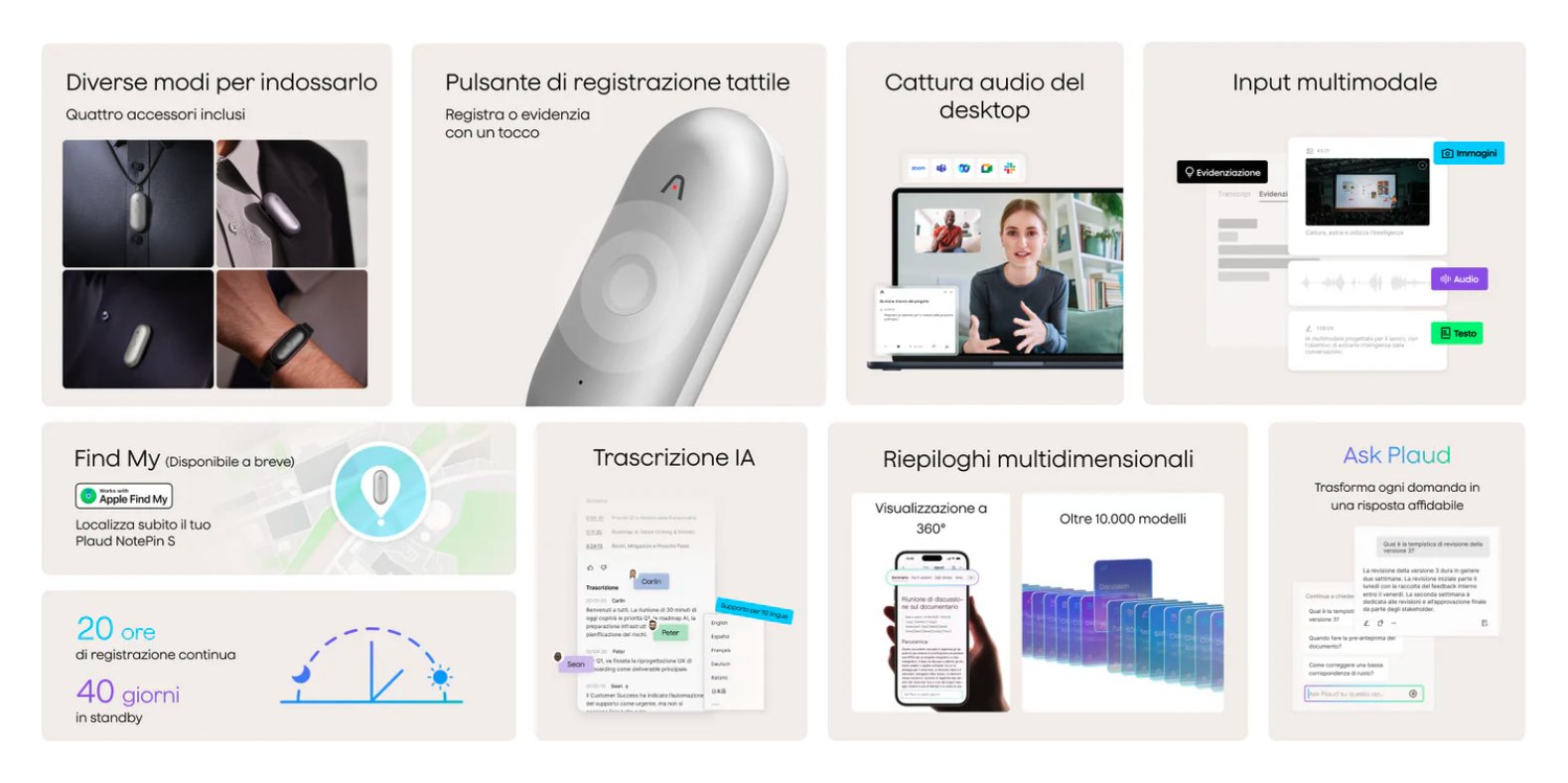 Dispositivo indossabile con intelligenza artificiale per prendere appunti e massimizzare la produttività. Grazie ai quattro accessori inclusi, Plaud NotePin S si adatta a qualsiasi giornata. Scegli il cordino per il collo, il braccialetto, la clip o la spilla magnetica per adattarlo al tuo stile. Massima professionalità con il tuo assistente intelligente sempre a portata di mano, dall’inizio alla fine della giornata.