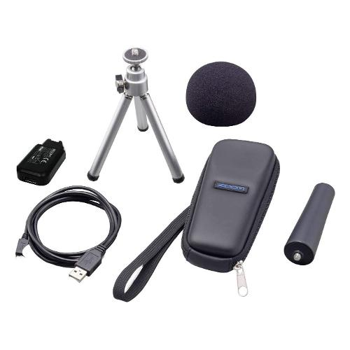 Kit di Accessori per il Registratore Palmare H1n. La confezione contiene antivento in spugna, alimentatore (tipo USB), cavo USB, treppiede regolabile, custodia imbottita e adattatore per clip microfonica.