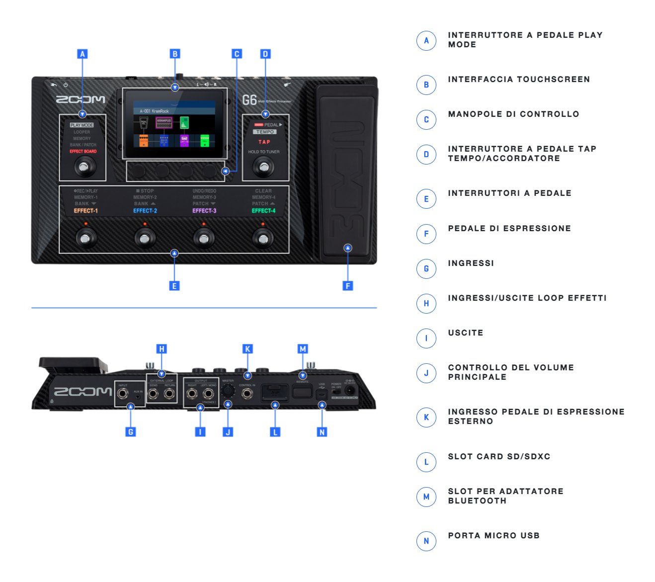 Portatile, versatile, e pieno di possibilità timbriche, G6 è perfetto per i chitarristi il movimento. G6 ha un ingresso mono, uscite stereo con controllo di volume, un loop effetti mono, ingresso ausiliario, ingresso di controllo e uscita cuffie. Usando la porta USB, G6 funziona anche come un'interfaccia audio 2in/2out per Mac e PC.