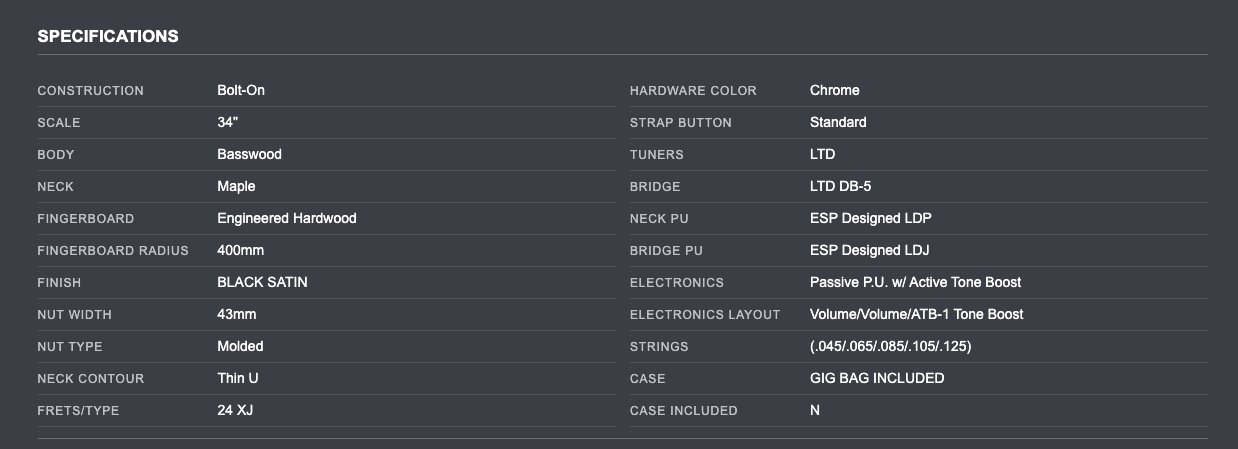 Anche se hai appena iniziato a suonare il basso, il B-15 Bass è la tua porta d'ingresso nella famiglia ESP. Ha un manico in acero a forma di U sottile, liscio e confortevole, che rende più facile sviluppare le tue abilità. È un basso molto comodo che chiunque può usare per imparare e suonare, e pickup ESP progettati con un buon suono che includono un controllo Tone Boost attivo. È anche un basso a 5 corde, che ti consente di scendere ancora più in basso (la corda bassa è accordata su B) per gli stili musicali moderni.