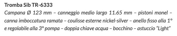 Campana Ø 123 mm. Canneggio medio largo 11.65 mm. Pistoni monel. Canna imboccatura ramata. Coulisse esterne nickel-silver. Anello fisso alla 1° e regolabile alla 3° pompa. Coppia chiave acqua. Bocchino. Astuccio “Light”