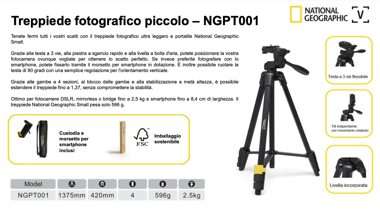 Tenete fermi tutti i vostri scatti con il treppiede fotografico ultra leggero e portatile National Geographic Small. Grazie alla testa a 3 vie, alla piastra a sgancio rapido e alla livella a bolla d'aria, potete posizionare la vostra fotocamera ovunque vogliate per ottenere lo scatto perfetto.
