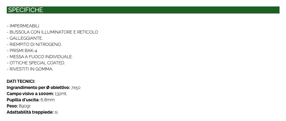 Il binocolo Tornado 7x50 è dotato di reticolo illuminato e bussola. E' un binocolo professionale che si presta al settore nautico in quanto oltre ad essere impermeabile è anche galleggiante. Quindi in caso di caduta accidentale in acqua, anche in caso di mare profondo o mosso, lo strumento resta a galla ed è pertanto facilmente recuperabile.