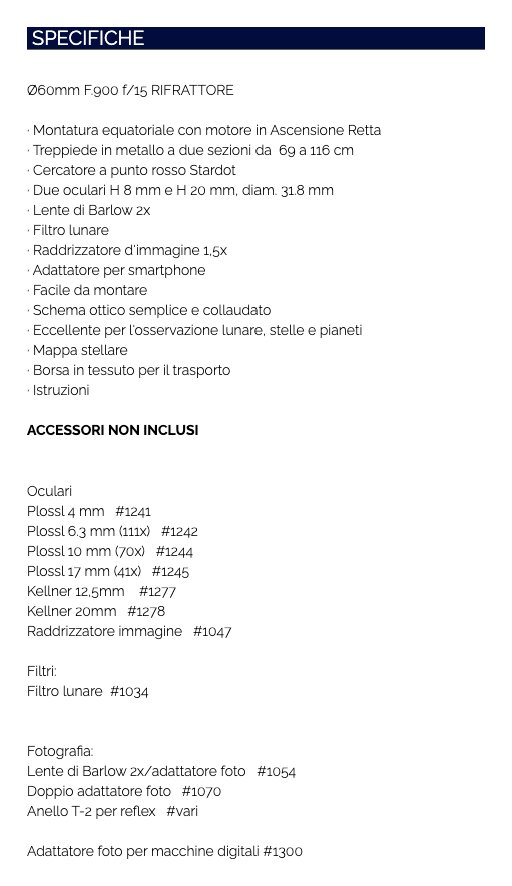 Questo telescopio gode già di un buon successo presso i giovani che amano l'astronomia: per questo motivo abbiamo pensato di fare una linea speciale più ricca, per aiutarli nella loro passione. Abbiamo aggiunto alla normale ricca dotazione una borsa in tessuto per rendere più pratico il trasporto del telescopio, ed anche il nuovo adattatore per smartphone e I-phone che consente di sfruttare pienamente tutte le Apps di contenuto astronomico disponibili su Playstore e Applestore.