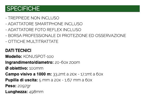 Questi potenti cannocchiali zoom offrono un'alta definizione dell'immagine ed una luminosità tra le migliori della categoria. Dispongono infatti di un ampio diametro dell'obiettivo e di un potente zoom che porta l'ingrandimento da 20x fino a 60x. Il corpo compatto e la meccanica di alta precisione assicurano qualità e robustezza.