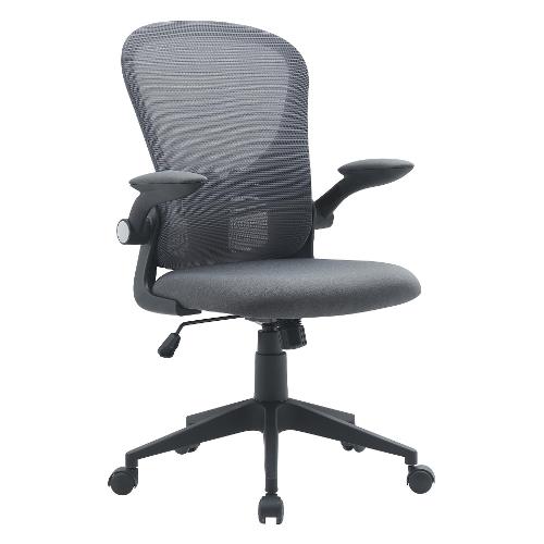 Base in nylon Ø 68 cm. Ruote in nylon. Seduta in compensato, imbottita in schiuma poliuretanica (densità 25kg/m3) e rivestita in tessuto Poliestere 100%. Schienale in plastica (pp) rivestito in tessuto a rete Poliestere 100% con supporto lombare. Braccioli ribaltabili in plastica (pp) rivestiti in tessuto Poliestere 100%. Regolazione dell'altezza con pistone a gas