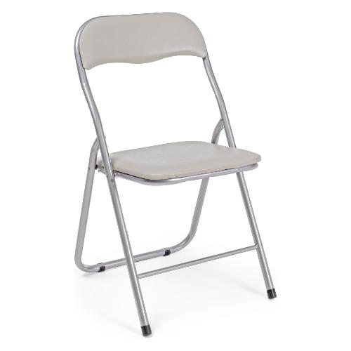 Struttura in acciaio verniciato a polvere silver (tubo Ø 22 mm). Seduta e schienale imbottiti e rivestiti in PVC opaco. Seduta pieghevole