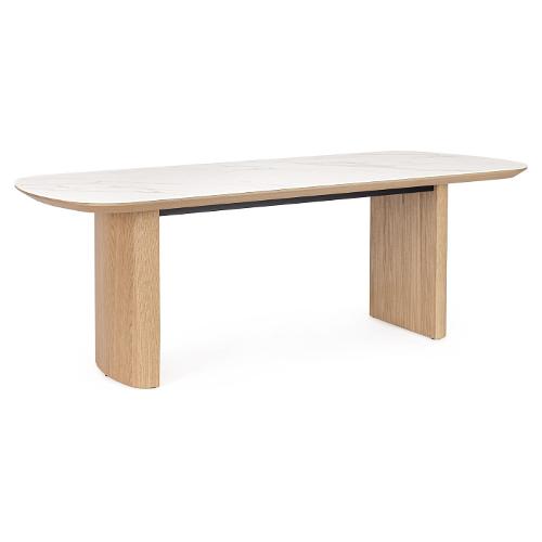 Struttura e gambe in MDF impiallacciato legno di quercia. Finitura a base di vernice poliuretanica. Piano in ceramica con supporto in acciaio verniciato a polvere epossidica