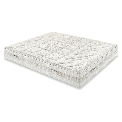 La superficie ricamata a doppia geometria, si coordina con la fascia perimetrale che accosta la microfibra trapuntata all'inserto centrale bicolore. Le zip nascoste su ambo i lati, consentono di rimuovere i due pannelli imbottiti