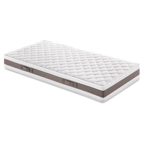 Materasso di 20 cm. di spessore caratterizzato da una fodera con imbottitura trapuntata e climatizzata sui due lati, e da una fascia personalizzata con inserto centrale in tessuto coordinato con le maniglie