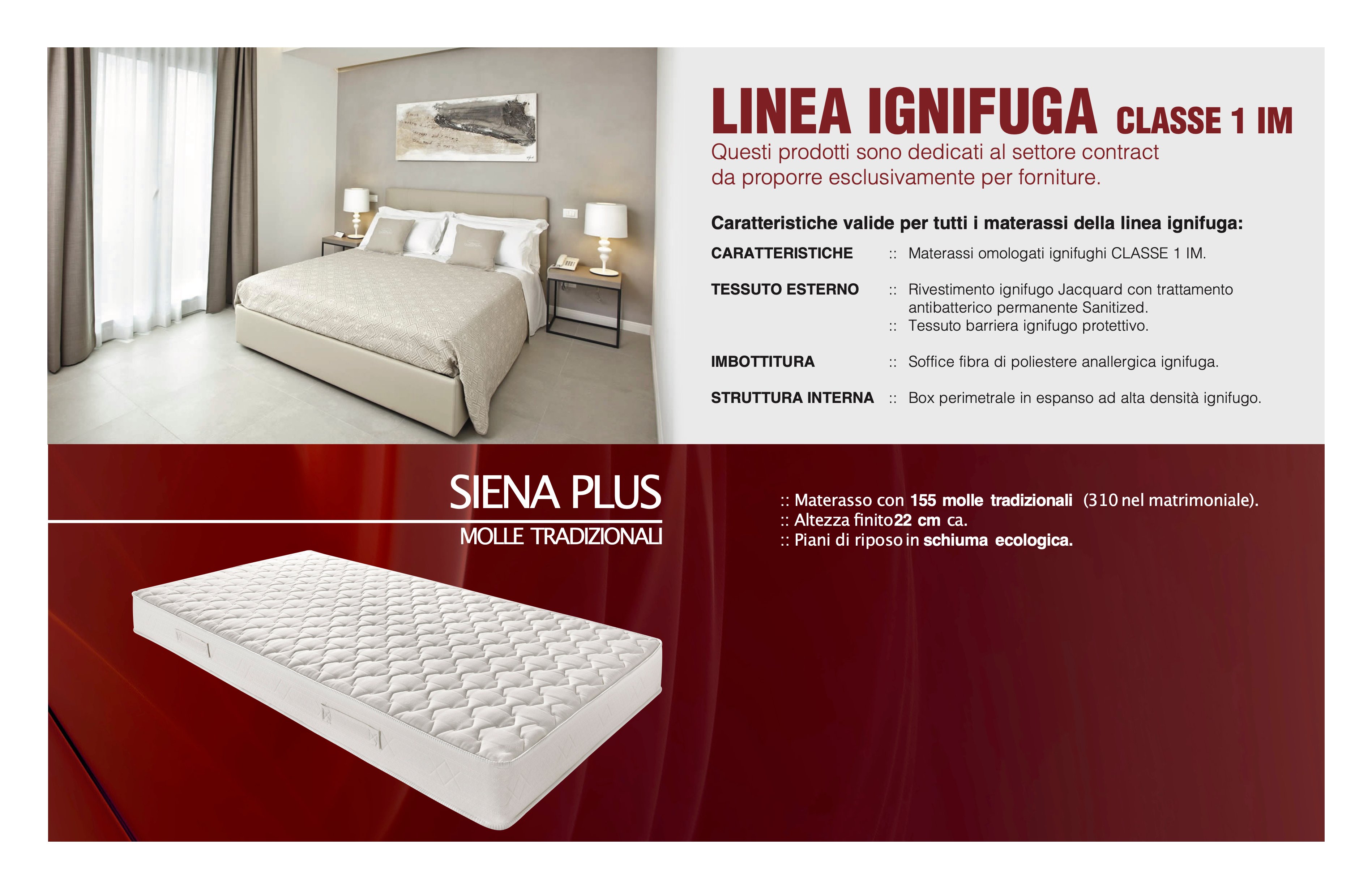 Materasso omologato ignifughi CLASSE 1 IM. Rivestimento ignifugo Jacquard con trattamento antibatterico permanente Sanitized. Tessuto barriera ignifugo protettivo. Soffice fibra di Poliestere anallergica ignifuga. Box perimetrale in espanso ad alta densità ignifugo