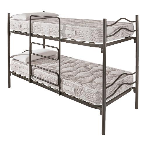 Struttura in acciaio con rete con profilo 40x25 mm., verniciata a polveri atossiche. Testiere con tubo diametro 40 mm. Doghe Multistrato di faggio da 68 mm. spessore 8 mm. a basso rilascio di formaldeide secondo la normativa classe E1. Consigliato materasso a molle tradizionali o schiumato. Scomponibile in due letti singoli