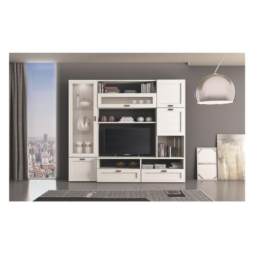Composto da 1 vetrina con 2 ante battenti; 1 base con 2 cassetti e 2 vani a giorno; 1 colonne con 2 ante battenti e 1 vano a giorno; 1 pensile con anta rialza; 1 vano a giorno
