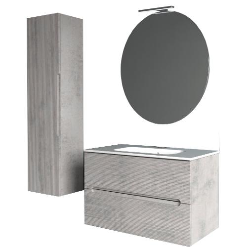 Composto da 1 base sospesa con 2 cassetti 80 x 45 h 50 cm; 1 colonna sospesa con anta battente reversibile 35 x 35 h 138 cm; 1 specchio 80 cm; 1 luce led