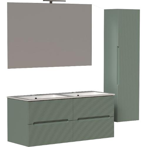Composto da 1 base sospesa con 4 cassetti 120 x 45 h 50 cm; 1 colonna sospesa con anta battente reversibile 35 x 35 h 138 cm; 1 specchio 120 h 75 cm; 1 luce led